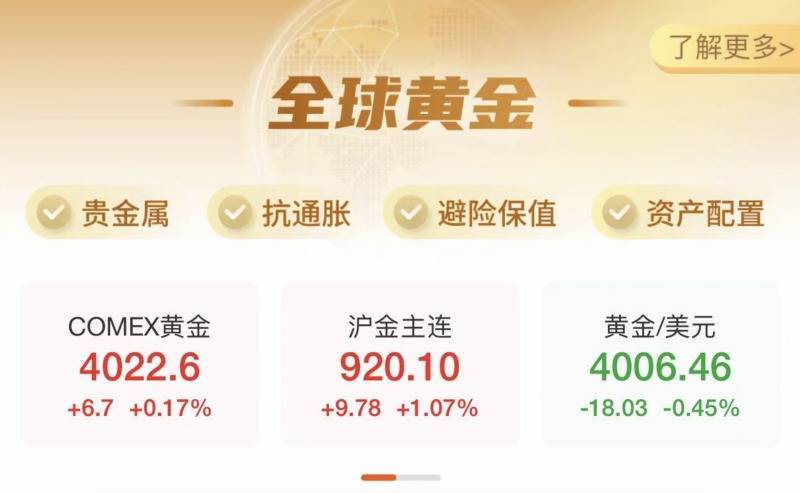 10月31日,现货黄金一度跌破4000美元/盎司,随后跌幅有所缩小,截至发稿时,现货黄金重新回到4000美元上方,报4006.46%,跌0.45%。