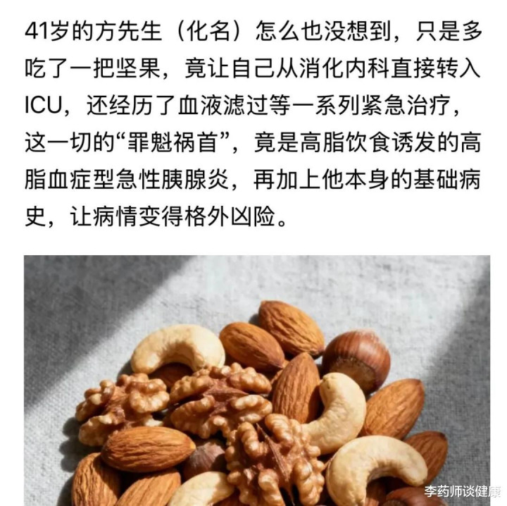 这样的标题党也就算了,文内还进一步强调了病例男子甘油三酯飙升,诱发急性胰腺炎,不得不紧急救治,住进重症监护室的主要原因,是因为吃坚果,这种因果关系从何而来,有没有科学道理,却只字不提。